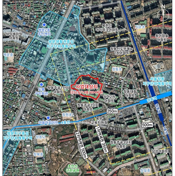 대상지 인근 창동상아2차, 창동주공2단지 등 재건축 시기가 도래한 주변 단지를 고려해 열린 경관축 확보, 도로변 개방형 커뮤니티시설 배치, 장ㆍ단기 교통처리(안) 검토 등 지역적 차원의 정비계획을 계획했다고 시는 설명했다.