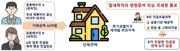 실제 국내 체류비자가 없는 비거주 외국인 A씨와 A씨의 내국인 컨설턴트 B씨는 투기과열지구 내 재정비촉진지구의 단독주택을 44억 원에 매수했다. B씨는 금융기관 예금액 4억 원과 현금 4억3000만 원으로 자금 일부를 조달했다고 소명했으나, B씨의 현금을 A씨가 입금하는 등 탈세목적의 편법 증여가 의심돼 국세청 조사를 받게 된다.