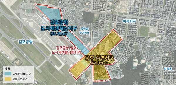 강서구 하늘길 111(공항동) 일원 107만 ㎡에 이르는 대상지는 공항과 주변 지역이 남부순환로에 의해 물리적으로 단절되고, 공항시설에 따른 개발 규제로 인해 건축물이 노후화됐다. 또 산업기능 부재로 인해 지역경제가 지속해서 쇠퇴하고 있는 곳이다.