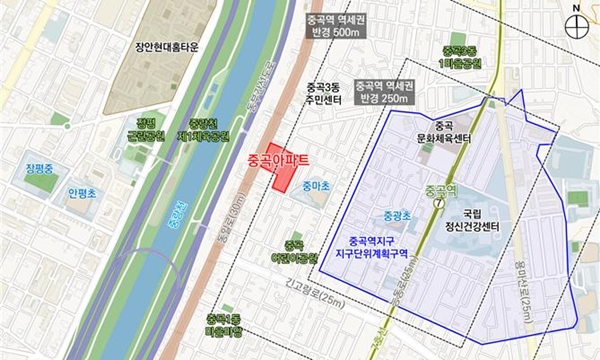 한편, 이곳은 지하철 7호선 중곡역이 인접해 교통환경이 양호하고 교육시설로는 중마초, 중광초 등이 있다. 중곡제일골목시장, 중곡어린이공원, 중곡3동주민센터 등 편의시설 이용도 편리하다.