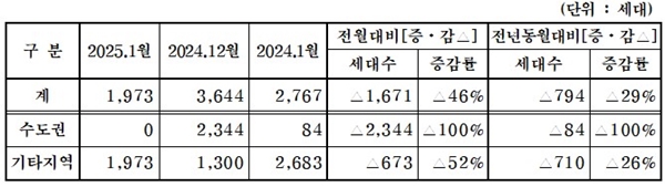이는 전월(3644가구) 대비 1671가구(46%) 감소한 것으로, 전년 동월(2767가구)과 비교해도 794가구(29%) 줄었다.