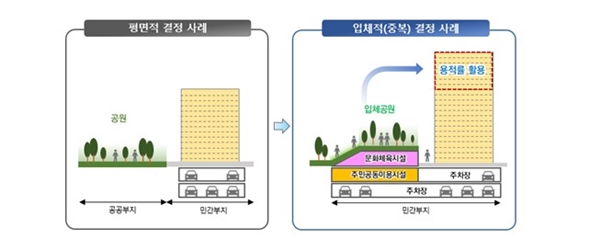 이에 공원은 토지 형태로의 기부채납을 원칙으로 하되, 지역 여건과 사업 특성을 고려해 공공성과 지속가능성이 확보되면 입체적으로 조성하는 공원을 허용키로 한 것이다.
