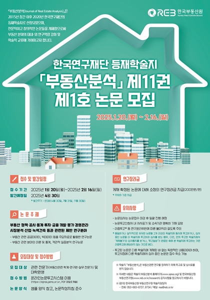 [아유경제=조명의 기자] 한국부동산원은 부동산 분야의 학술 교류와 연구 활동 장려를 위해 등재학술지 `부동산분석` 제11권 제1호(올해 4월 30일 발간 예정)에 수록할 논문을 모집한다고 밝혔다.