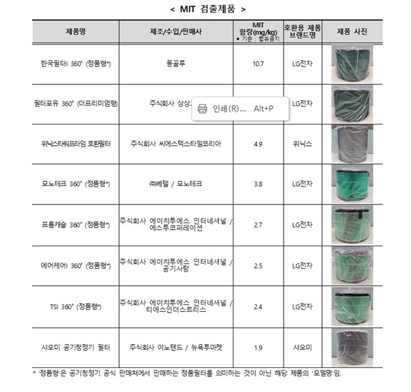 이달 22일 환경부는 한국소비자원, 한국환경산업기술원과 지난해 공기청정기 필터에 대한 안전성 조사 결과, 메틸이소티아졸리논(MIT)이 최소 1.9㎎/㎏~최대 10.7㎎/㎏ 검출됐다고 밝혔다. MIT는 노출 시 호흡기, 피부 등에 자극을 일으킬 수 있는 것으로 알려졌다.