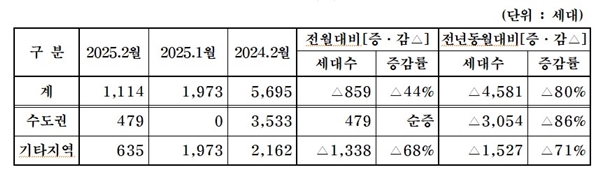 이는 전월(1973가구)과 비교해 859가구(44%) 감소했으며, 전년 동월(5695가구) 대비로도 4581가구(80%) 감소한 수치다.
