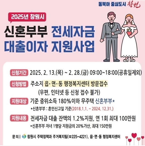 지원 대상은 ▲공고일 현재 부부 모두 창원시에 주소를 둔 무주택 신혼부부 ▲혼인신고일 7년 이내인 신혼부부(2018.1.1.~2024.12.31.) ▲기준중위소득 180% 이하(2인 기준 662만 9000원)로 전세자금 대출이 있는 신혼부부다.
