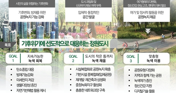 또한 ▲녹색 회복 ▲녹색 채움 ▲녹색 이용이라는 3개 목표를 통해 광역에서 생활권까지 촘촘한 그린네트워크를 구축해 나간다는 계획이다. ▲저출산, 고령화, 1인 가구 증가 등 인구 구조 변화 ▲미세먼지 및 기후변화 대응 ▲공원의 질적 개선 ▲적극적인 여가공간 확보 ▲스마트 기술의 발달 등 기본계획에 다양한 사회ㆍ환경적 변화와 요구를 반영했다.