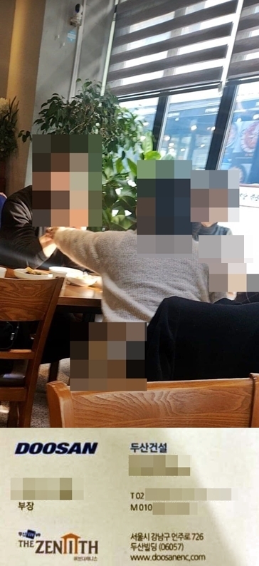 문제는 일부 조합원 사이에서는 이런 상황 속에서도 특별히 달라진 점이 없었다는 불만이 형성된 점이다. 이달 6일 유관 업계 관계자 등은 두산건설 직원과 조합원 소유의 한 공인중개사사무소가 모 식당을 방문했고 두산건설 측에서 결제까지 마친 증거 영상 및 결제 내역을 한 조합원으로부터 제보받아 공개했다.