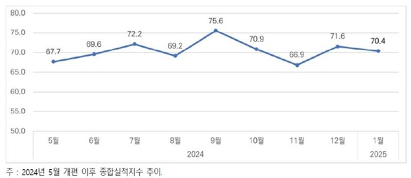 이 지수는 2024년 10월(70.9)부터 전월 대비 2개월 연속 하락했으나 같은 해 12월(66.9→71.6)에는 건설사들의 연말 수주 물량이 몰리며 전월 대비 4.7포인트 올랐다. 하지만 지난 1월에는 수주 증가 효과가 사라지며 한 달 만에 하락 전환했다.