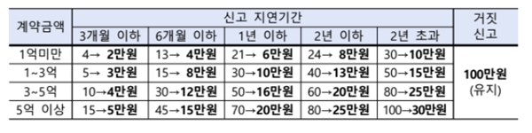 이에 국토부는 시행령 개정을 통해 단순히 지연 신고한 경우에는 과태료 상한액을 최대 30만 원으로 낮추고, 거짓 신고한 경우에는 현행 과태료 부과 기준인 100만 원을 그대로 유지하는 제도 개선을 추진키로 했다.