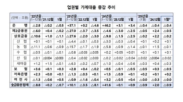 금융위원회와 금융감독원이 이달 12일 발표한 `2025년 1월 가계대출 동향(잠정)`에 따르면 지난 1월 전 금융권 가계대출은 전월에 비해 9000억 원 줄었다.