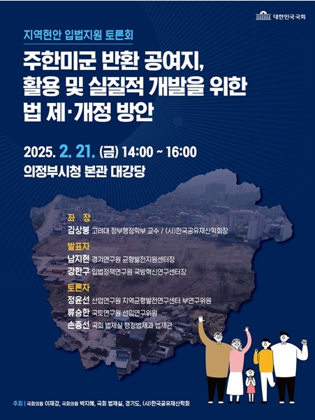 토론회에서는 남지현 경기연구원 균형발전지원센터장과 강한구 입법정책연구원 국방혁신연구센터장이 각각 `반환공여구역 현황 및 제도적 개선 방안`, `주한미군 반환구역의 활용 실태와 문제 극복 방안의 모색`을 주제로 발표한다.