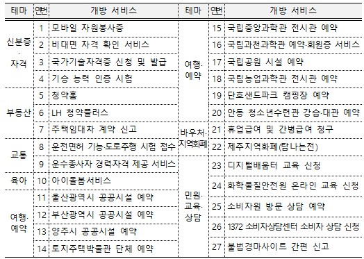 한편, 행안부는 지난해 11월부터 국민ㆍ기업 수요 조사, 기개방 서비스와의 연관성 등을 토대로 서비스 소관 기관과 협의를 거쳐 8개 분야 27종의 공공서비스를 신규 개방 대상으로 선정했다.