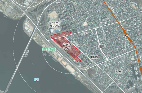 마포구 희우정로 125(망원동ㆍ동덕주택) 일원 8515.6㎡를 대상으로 한 마포구 망원동 454-3 일대 모아주택은 지하 2층~지상 25층 공동주택 5개동 218가구(임대 42가구)를 조성하는 내용을 골자로 한다. 전체 가구수의 10% 이상을 임대주택으로 짓고 공동이용시설을 설치함에 따른 용적율 완화와 용도지역 상향(제2종일반(7층 이하)→제2종일반주거지역) 혜택이 적용됐다.