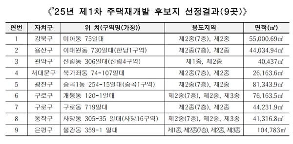 이번에 선정된 구역은 ▲강북구 미아동 75 일대 ▲용산구 이태원동 730 일대(한남1구역) ▲관악구 신림동 306 일대(신림4구역) ▲서대문구 북가좌동 74-107 일대 ▲광진구 중곡1동 254-15 일대(중곡1구역) ▲구로구 개봉동 120-1 일대ㆍ구로동 719 일대 ▲동작구 사당동 305-35 일대(사당16구역) ▲은평구 불광동 359-1일대 등 9곳이다.