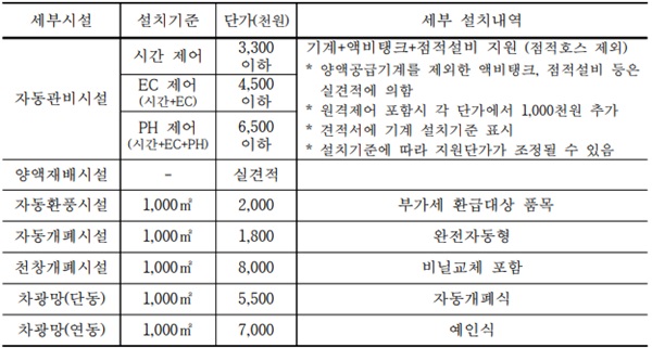 지원 규모는 1인당 최대 2000만 원으로, 환경관리시설(자동관비시설ㆍ양액재배시설ㆍ자동환풍시설ㆍ자동개폐시설ㆍ천창개폐시설ㆍ차광망 등)을 지원할 방침이다.