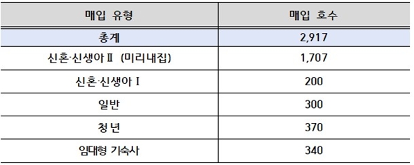 올해 총 매입 목표는 5350가구이나, 지난해 매입한 이월 물량 1206가구와 지난해 사전매입공고 물량 1000가구를 제외하고 이번에 2917가구 매입을 추진한다.