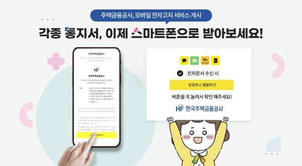 [아유경제=조명의 기자] 한국주택금융공사(HF)는 최근 공사에서 발송하는 통지서와 안내장 등 고지문을 고객 본인명의의 휴대전화로 발송하는 `전자고지 서비스`를 시행한다고 밝혔다.