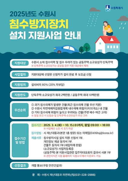 수원시 관계자는 "풍수해는 예방이 무엇보다 중요하다"며 "이번 지원사업으로 건축물 침수 피해를 예방하고 시민의 생명과 재산을 보호하겠다"고 말했다.