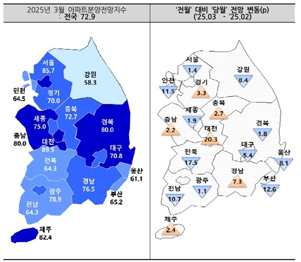 최근 주택산업연구원(이하 주산연)이 주택사업자를 대상으로 설문조사한 결과 올해 3월 아파트 분양전망지수는 전국 평균 2.5p 하락한 72.9로 나타났다. 전망지수가 100을 초과하면 분양 전망이 긍정적, 100 미만이면 부정적이라는 의미다.
