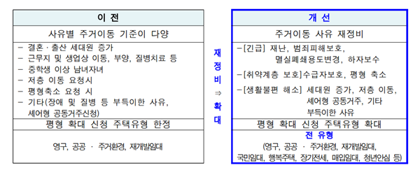 이에 서울주택도시공사(SH)는 범죄피해 보호, 하자보수 등 주거 이동이 긴급한 사유에 대한 항목을 신설해 보호가 필요한 입주민이 우선적으로 이동하도록 기준을 마련한다. 또한 입주 후 세대원 증가 시 평형 확대가 가능한 기준도 개선한다. 범죄피해 등 긴급 주거 이동 사유 1순위를 제외한 모든 주거이동 신청은 분기별 무작위 전산 추첨 방식으로 진행하고 반복적인 동일 사유 신청은 제한할 계획이다.