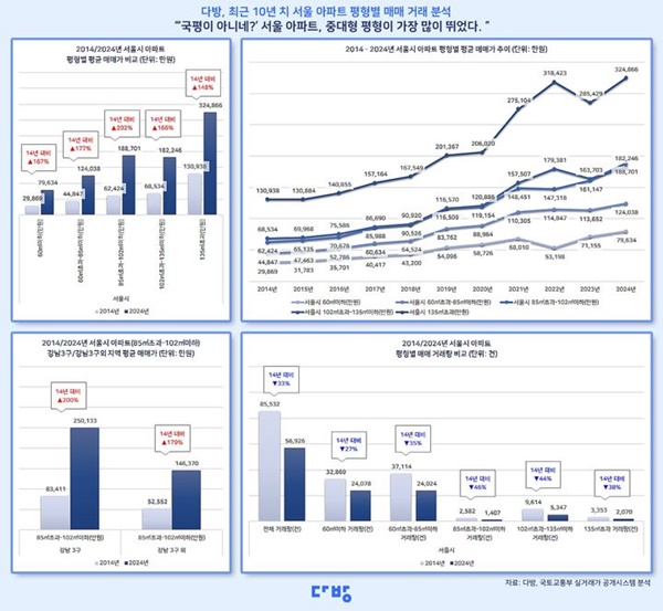 이달 11일 부동산 정보 플랫폼 다방이 국토교통부 실거래가를 기반으로 2014년부터 2024년까지 서울 지역 아파트 매매를 분석한 결과, 강남 3구와 그 외 지역의 아파트(전용면적 85㎡ 초과 102㎡) 평균 매매 가격 차이가 2014년 3억859만 원에서 2024년 10억3763만 원으로 3배 넘게 벌어졌다.