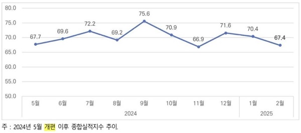 이달 11일 한국건설산업연구원(건산연)은 지난 2월 CBSI가 전월 대비 3포인트 하락한 67.4로 나타났다고 밝혔다.