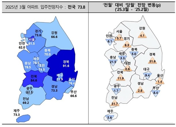 비수도권에서 광역시는 71.9로 전월(75.3)에서 3.4p, 도 지역은 75.9로 전월(78)에서 2.1p 각각 하락했다.