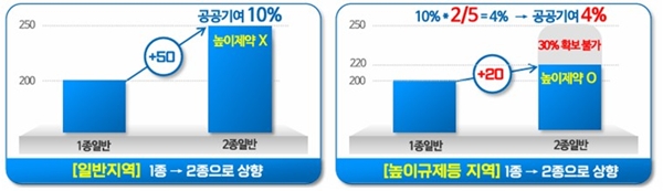 먼저 높이규제지역에서 공공기여 의무비율이 낮아진다. 그동안 고도ㆍ경관지구에 저촉되거나 문화재ㆍ학교 주변 지역, 구릉지 등 높이 제약을 받았던 지역에서 용도지역 상향 시 일률적인 공공기여 비율(10%)이 적용이 아닌, 실제 추가 확보된 용적률에 비례한 비율을 적용한다. 예를 들어 용도지역이 제1종(200%)에서 제2종(250%)으로 상향됐더라도 높이 제약 등으로 용적률이 220%밖에 되지 않는다면, 공공기여는 10%가 아닌 4%만 부담하면 된다.