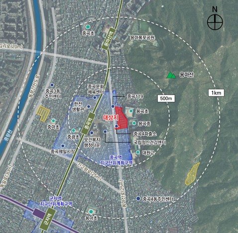 이곳은 지하철 7호선 중곡역이 10분 이내에 있고 교육시설로는 용곡초, 용곡중, 대원고, 대원외국어고, 대원여자고 등이 있다. 주변에 국립정신건강센터, 중락천제1체육공원, 광진장미정원, 장평체육공원, 중랑천이 인접해 의료시설 및 쾌적한 주거환경을 갖추고 있다.