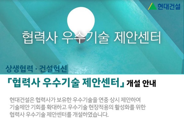 이달 18일 현대건설은 협력 업체가 보유한 우수 아이디어를 적극 발굴하고 혁신 기술의 현장 적용을 확대하기 위해 `협력사 우수기술 제안센터`를 개설했다고 밝혔다.