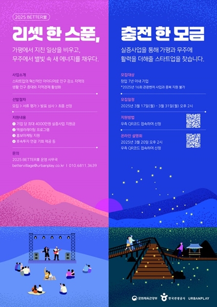 이달 17일 문화체육관광부와 한국관광공사는 오는 31일까지 지역 관광실증사업인 `2025 배터리(BETTER里)`에 참여할 스타트업 14개 기업을 공개 모집한다고 밝혔다.