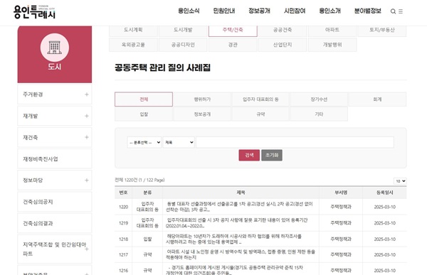용인시는 최근 공동주택 관련해 ▲단지 내 공사 추진 절차 ▲입주자와 관리 주체 간 이견 해결 방법 ▲관련 법령 문의 등 시민 문의가 증가함에 따라 이에 효율적으로 대응하기 위해 답변이 완료된 민원 1220건의 DB화를 진행, 키워드로 검색하면 관련 질문을 찾아볼 수 있는 시스템을 시 홈페이지에 구축했다고 지난 16일 밝혔다.