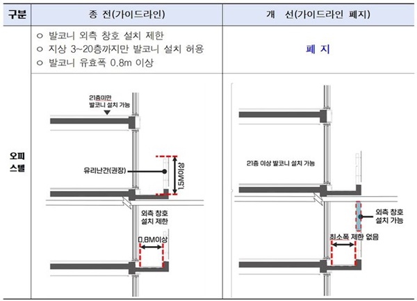 이에 따라 앞으로 오피스텔 발코니 외측에 창호 설치가 가능해졌다. 기존 오피스텔의 발코니 설치 허용 범위(지상 3층~20층)도 완화됐으며, 발코니 유효폭 0.8m 이상 등의 기준 또한 사라졌다.
