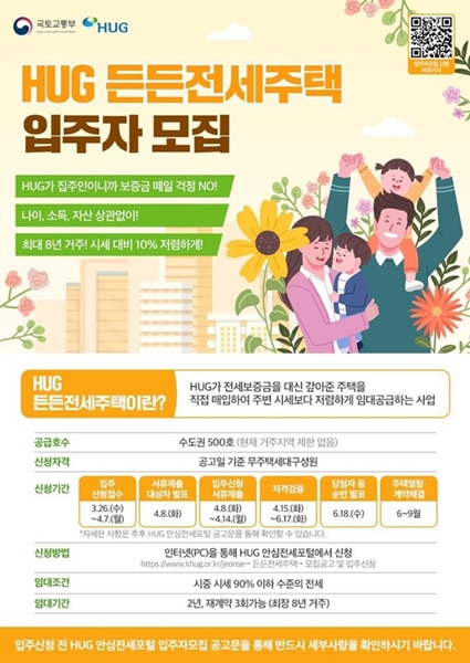 [아유경제=박창욱 기자] 주택도시보증공사(HUG)가 제6차 `든든전세주택` 입주자를 모집한다.