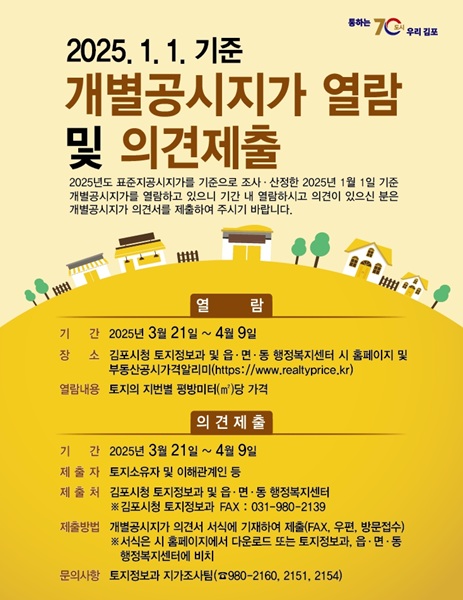 [아유경제=오수영 기자] 경기 김포시가 이달 21일부터 오는 4월 9일까지 개별공시지가에 대한 열람 및 의견 접수를 진행한다.