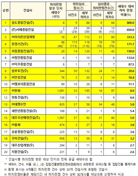 하자판정 비율을 기준으로 하면 8가구에서 64건의 하자가 발생해 하자 판정 비율 800%를 기록한 삼도종합건설이 1위에 랭크됐다. 2~5위는 ▲서해종합건설(650%) ▲아이온산업개발(333.3%) ▲한경기건(171.7%) ▲라임종합건설(150%)로, 공급 가구수가 50가구 미만인 소규모 업체가 주를 이뤘다.