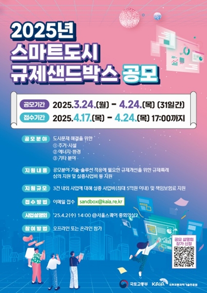 [아유경제=조명의 기자] 국토교통부(장관 박상우ㆍ이하 국토부)는 최근 다양한 스마트도시 기술ㆍ서비스 규제 완화를 위해 규제샌드박스 공모를 확대한다고 밝혔다.