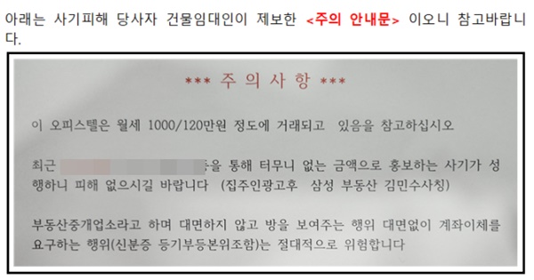비밀번호를 알아 낸 A씨는 한 온라인 직거래 플랫폼에에 해당 오피스텔을 `보증금 1000만 원ㆍ월세 50만 원` 등 실제보다 50% 이상 저렴하게 임대한다는 허위 광고를 게시했다. 이후 A씨는 피해자들에게 오피스텔 비밀번호를 알려주며 내부를 둘러보게 했고, 피해자들은 시세보다 저렴한 월세에 A씨와 계약을 서둘렀다는게 박씨의 설명이다.