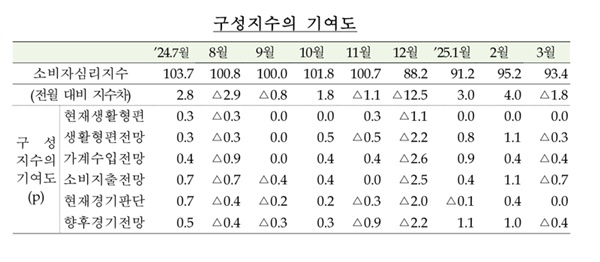 이달 25일 한국은행이 발표한 `소비자동향조사` 결과에 따르면 이달 소비자심리지수(CCSI)는 93.4로 지난 2월(95.2)보다 1.8포인트 떨어졌다.