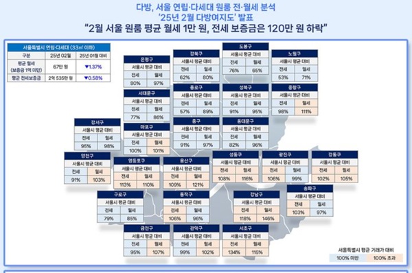이달 25일 부동산 정보 플랫폼 다방이 국토교통부 실거래가를 바탕으로 올해 2월 서울 지역 연립ㆍ다세대 원룸(전용면적 33㎡ 이하)의 시세를 분석한 `다방여지도`에 따르면 보증금 1000만 원 기준 평균 월세는 67만 원이다. 평균 전세 보증금은 2억535만 원이다.