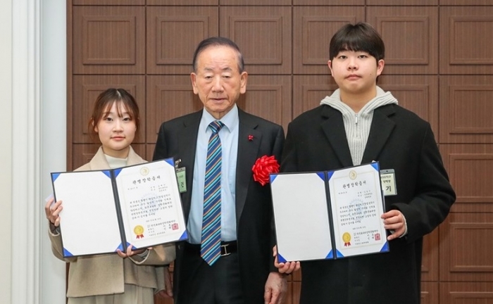 이동건 국제로타리 전 세계회장이 장학생 심예진(좌, 홍익대),