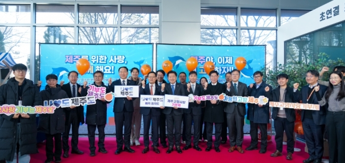 오영훈 제주도지사와 손재일 한화시스템 대표이사는 현장 참여자와 온라인 생중계로 연결된 사무소 직원들을 대상으로 고향사랑기부제 관련 퀴즈 이벤트를 진행하며 제주사랑 실천을 독려했다.