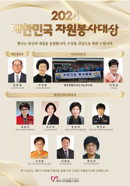 강현주(외도동장애인지원협의회장) △김은미(수운교청정봉사단 총무국장), 문순여(용담1동지역사회보장협의체 간사), 변인순(제주소방서직할여성의용소방대장), 오의합(제주소방서직할여성의용소방대 총무부장), 이태영(제주희망봉사단원), 한순자(제주여성교통봉사대장)이 행정안전부장관 표창을 받았다.