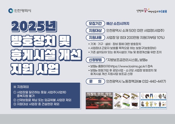 [아유경제=오수영 기자] 인천광역시가 50인 미만 소규모 사업장을 대상 `방호장치 및 휴게시설 개선 지원사업`을 시행한다.