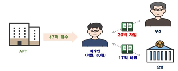 #30대 남성 매수인은 서울 B구 소재한 아파트를 47억 원에 매수하면서 자기자금 17억 원, 부친에게 빌린 돈 30억 원으로 자금을 마련했다. 국토부는 자기자금보다 차입금이 과다해 증여로 추정됨에 따라 소명자료를 징구해 정말 조사를 실시 중이며, 차입금을 활용한 편법 증여에 해당할 경우 국세청 통보할 예정이다.
