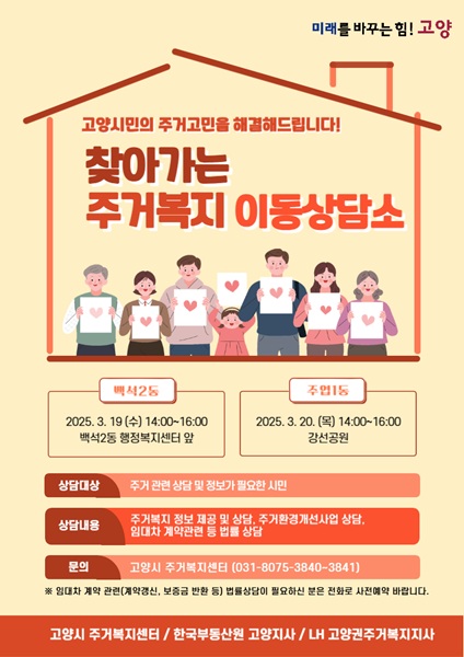 또한 해당 사업에는 고양시 주거복지센터, 행정복지센터, 한국부동산원 고양지사, 한국토지주택공사(LH) 고양권주거복지지사 등이 참여해 다양한 분야 관련 상담을 제공할 예정이라고 전했다.
