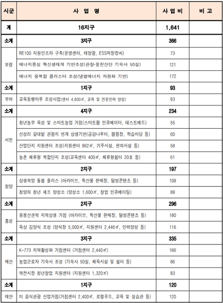 이어 올해는 2차 시ㆍ군 자율사업 대상지로 ▲보령 3건 366억 원 ▲부여 1건 93억 원 ▲서천 4건 234억 원 ▲청양 2건 197억 원 ▲홍성 2건 296억 원 ▲예산 3건 335억 원 ▲태안 1건 120억 원 등 16지구를 선정했다.
