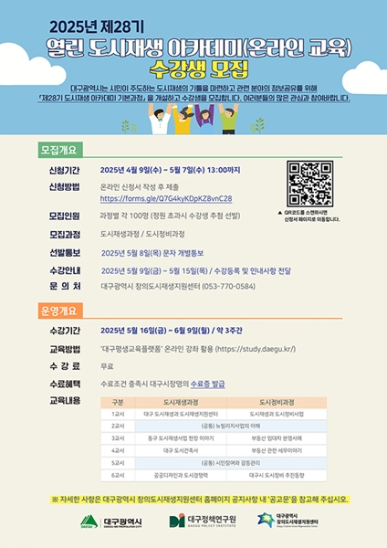 [아유경제=조명의 기자] 대구광역시는 오는 5월 16일부터 3주간 운영하는 `제28기 열린 도시재생 아카데미 기본과정(온라인)`의 수강생을 모집한다고 최근 밝혔다.