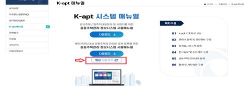이번 동영상 매뉴얼은 K-apt 신규 가입, 단지 정보 입력, 관리비 공개 방법에 대한 공동주택 관리인의 시스템 이해도를 높이기 위해 제작됐다. K-apt 누리집 또는 한국부동산원 유튜브 채널에서 확인할 수 있다.